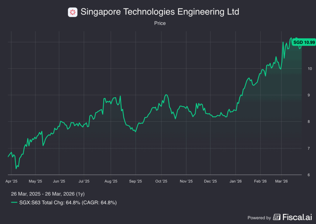 ST Engineering’s consistent order book growth and earnings resilience have been reflected in its share price over the past year, rising about 65% to the current price of S$10.99.