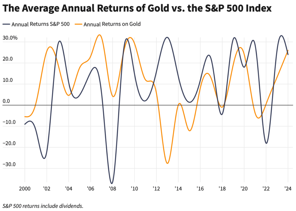 Simply put, when prices of stocks and bonds drop, gold prices often rise, making it a useful safety net for investors.